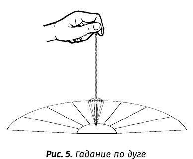 Чтобы определить оптимальное время воздействия камня, используйте дугу. Начертить ее нужно заранее, отметив интервалы времени в пять минут, час или сутки, предварительно уточнив, следует ли фиксировать их в минутах, часах или днях. Для этого разместите руку с маятником над центром дуги и попросите маятник указать правильный ответ (см. рис. 5).