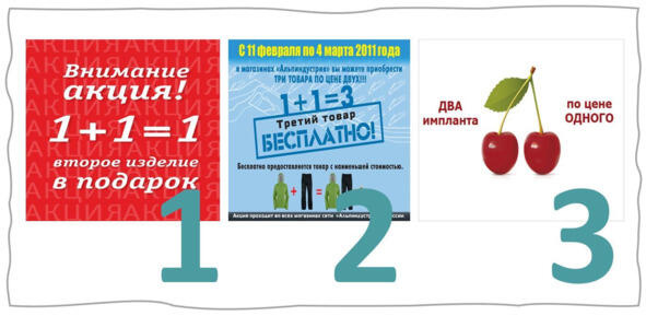 В данной ситуации более выигрышным является вариант 2. Потребитель должен однозначно понять, что он заплатит только за два продукта, и еще один ему вручат бесплатно. В варианте 1 покупателя может смутить некорректная формула. А вариант 3 это тот случай, когда человеку в принципе может быть и не нужен второй продукт (даже в подарок).
