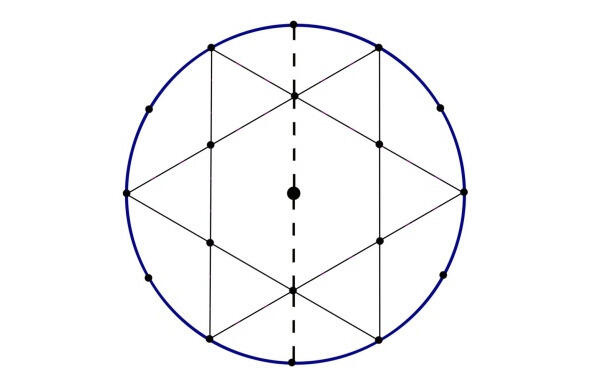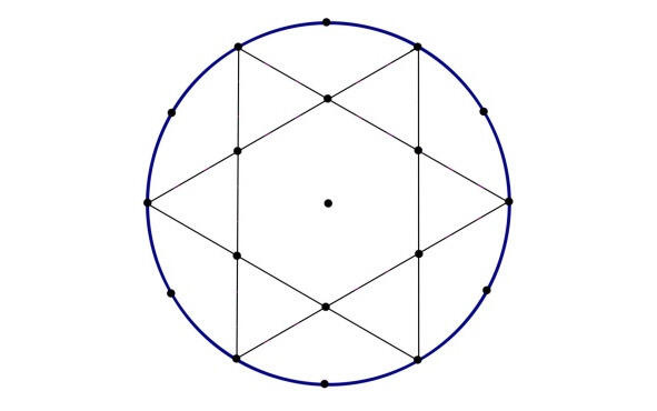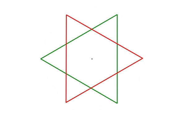 С точки зрения геометрии, шестигранник, малые треугольники и звезда образуются в результате наложения центров двух одинаковых равносторонних треугольников (больших), развёрнутых относительно друг друга на 180 градусов (см. рис. 6).