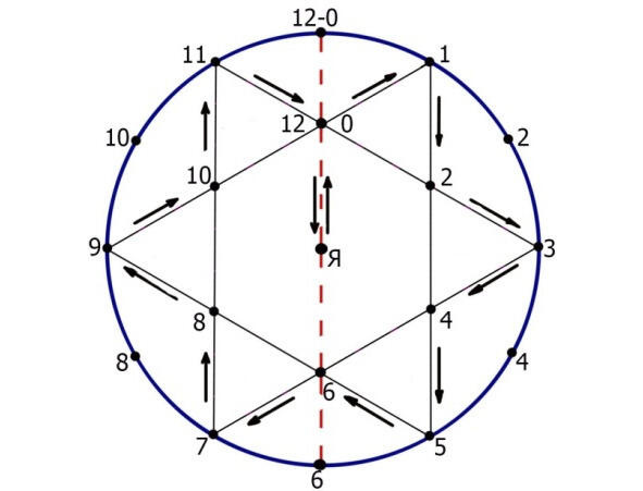Модель Звезда СиМ составляют 12 главных векторов, обрамляющих концы звезды, плюс круговой вектор, плюс 2 противоположных вектора Я0 и 12Я. Ещё в модели имеется множество неосновных векторов. Неосновные вектора на рисунке стрелками не отмечены это все имеющиеся линии разной протяжённости и направления (см. рис. 8). На рисунке показано основное направление векторов, но это не означает, что вектора не могут быть направлены в противоположную сторону.