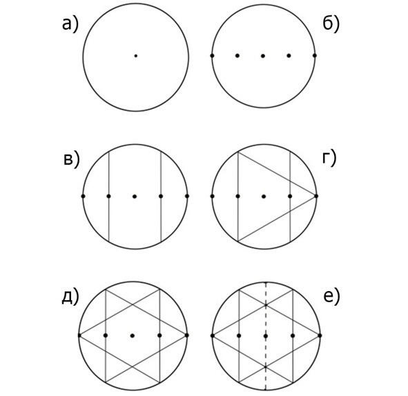 Это один из наиболее простых вариантов рисования модели Звезда. Нарисуйте круг и центральную точку (см. рис. 9, а).