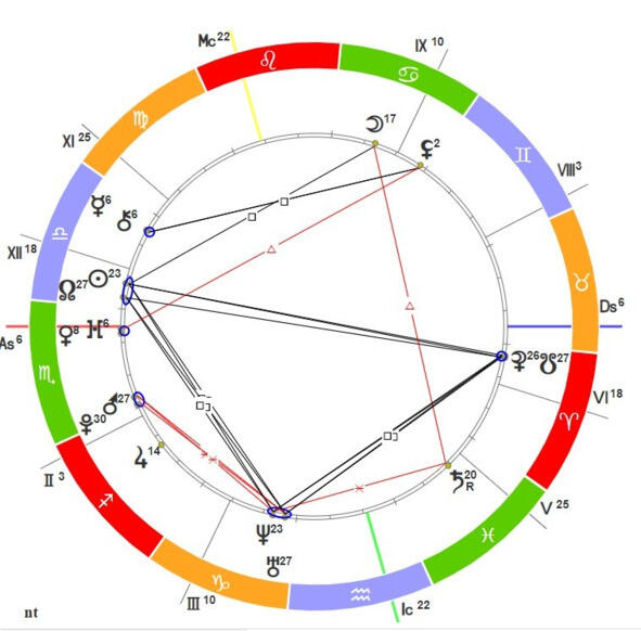 Кстати, цвета стихий вы можете увидеть на натальной карте в данном примере мы видим, что огненная стихия это красный цвет, воздушная голубой, водная зелёный и земная оранжевый. Здесь мы видим Асцендент в зелёном секторе (знак Скорпиона), а Десцендент в оранжевом (Телец).