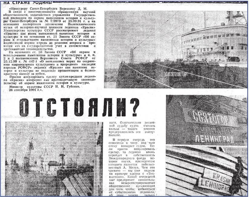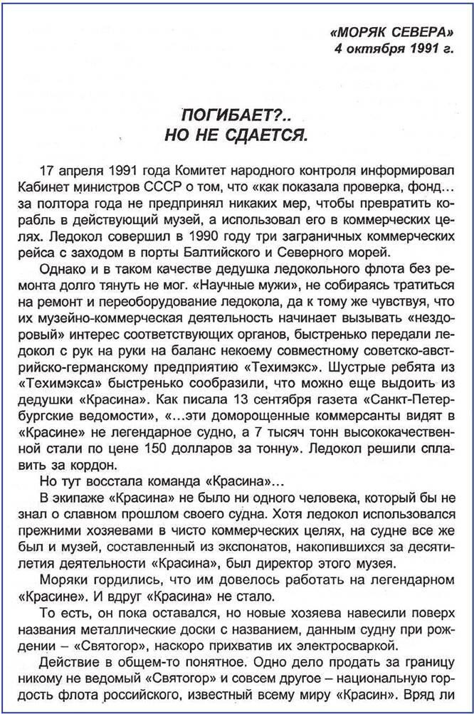 Таким образом, на борту музея «КРАСИН» нет экспонатов и документов о событиях 199192 гг., давших, собственно говоря, возможность продолжения земной жизни «КРАСИНА», а значит, и существования вышеупомянутого музея.