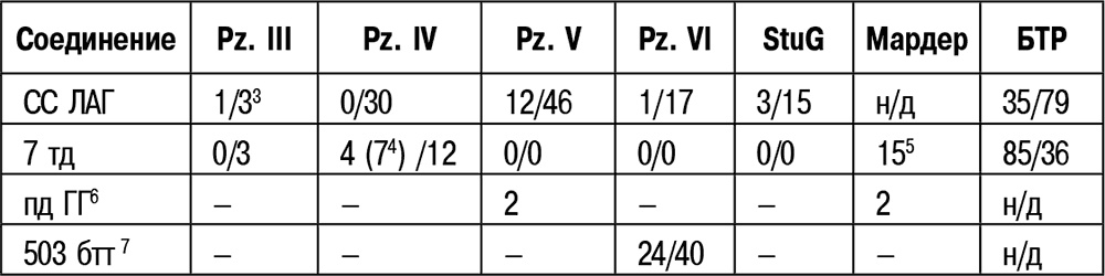 Для латания бреши на левом фланге ГА «Юг» было выбрано проверенное в боях управление XXXXVIII танкового корпуса. Штаб корпуса отличился еще в боях на Чире в нояб ре декабре 1942 г., при восстановлении фронта после окружения армии Паулюса под Сталинградом. Командовал корпусом генерал танковых войск Герман Бальк, на Чире участвовавший в бою в качестве командира 11-й танковой дивизии. Корпус всю зимнюю кампанию 19431944 гг. использовался в качестве «пожарной команды» группы армий «Юг». В подчинение XXXXVIII корпуса первоначально передавались дивизия «Генерал-Губернаторство», 7-я танковая дивизия и так называемая группа фон дер Баха. Несколько позднее, с началом советского наступления, корпусу передали дивизию «Лейбштандарт СС Адольф Гитлер» и 503-й батальон тяжелых танков. Состояние танкового парка этих соединений и батальона «Тигров» показано в таблице.
