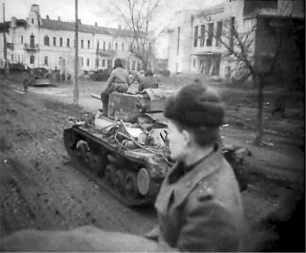 Полученный по ленд-лизу английский танк «Валентайн» на улице западноукраинского города. Три десятка таких машин насчитывалось в корпусах и мотоциклетном полку 4-й танковой армии.