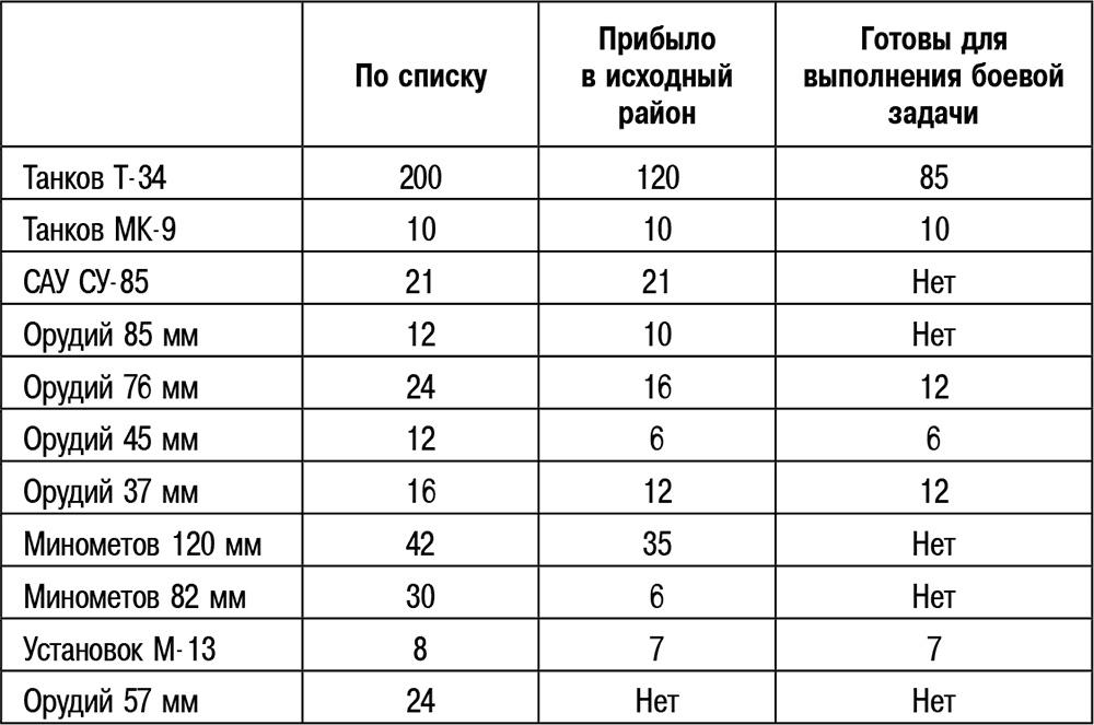 По приведенным данным видно, что корпус оказался лишен ценных для борьбы с новыми танками противника 57-мм орудий ЗИС-2 и фактически лишен 85-мм пушек (62-й гв. иптд[7] прибыл, но имел всего 0,25 заправки). В целом из 415 артиллерийских и минометных стволов к исходу 3 марта 1944 г. боеготовых в корпусе имелось всего 134 ствола, что составляло лишь 32 % к их общему числу. Из стрелковых частей в исходный район вышел только один (!) мотострелковый батальон, что составляло 16 % к общему числу пехоты, имевшейся в корпусе. Полностью готовой к бою была только одна 61-я гв. танковая бригада (из трех танковых и одной мотострелковой бригады), полностью сосредоточившаяся и имеющая 1,5 боекомплекта боеприпасов и 1 заправку горючего.