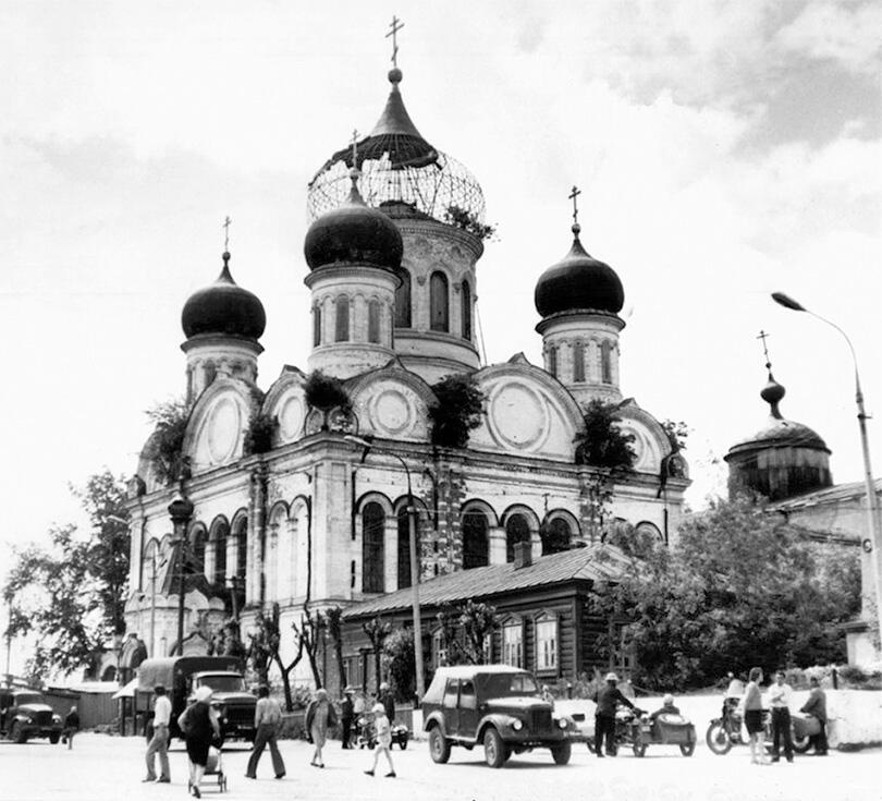 Рогачево в 80-е годы. Вид на Никольский храм со стороны центральной площади. Почти так же это место выглядело перед оккупацией. Только справа, где виден обелиск памяти односельчан, не вернувшихся с войны, стояло каменное здание, снесенное в конце 50-х гг.