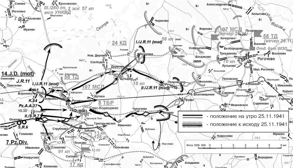 Спустя несколько часов батальон приказом корпуса был возвращен в подчинение своей дивизии, но практически весь день 25 ноября между двумя соседними соединениями вермахта происходили препирательства по поводу использования этой части[24]. В результате, захватив к 18.00 Спас-Коркодино, мотоциклетный батальон оставался там без дела. Только в 3.30 ночи следующих суток 7-я танковая дивизия (после нескольких жалоб командования 14-й моторизованной дивизии корпусу) окончательно отказалась от притязаний на него. В результате батальон выдвинулся в боевую линию 14-й моторизованной дивизии только к концу дня 26 ноября.
