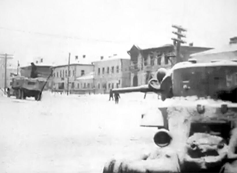 Танк БТ-7, подбитый в Рогачеве 26 ноября и простоявший до дня освобождения. Кадр из документального фильма «Разгром немецких войск под Москвой».