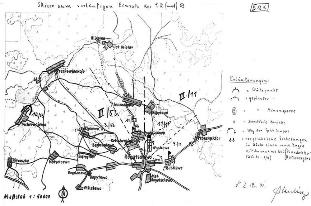 Эскиз оборонительных позиций 53-го пп под с. Рогачево. (Kriegstagebuch la. 14 Jnf. Div. (mot) vom 30.11.41. 31.12.41.)