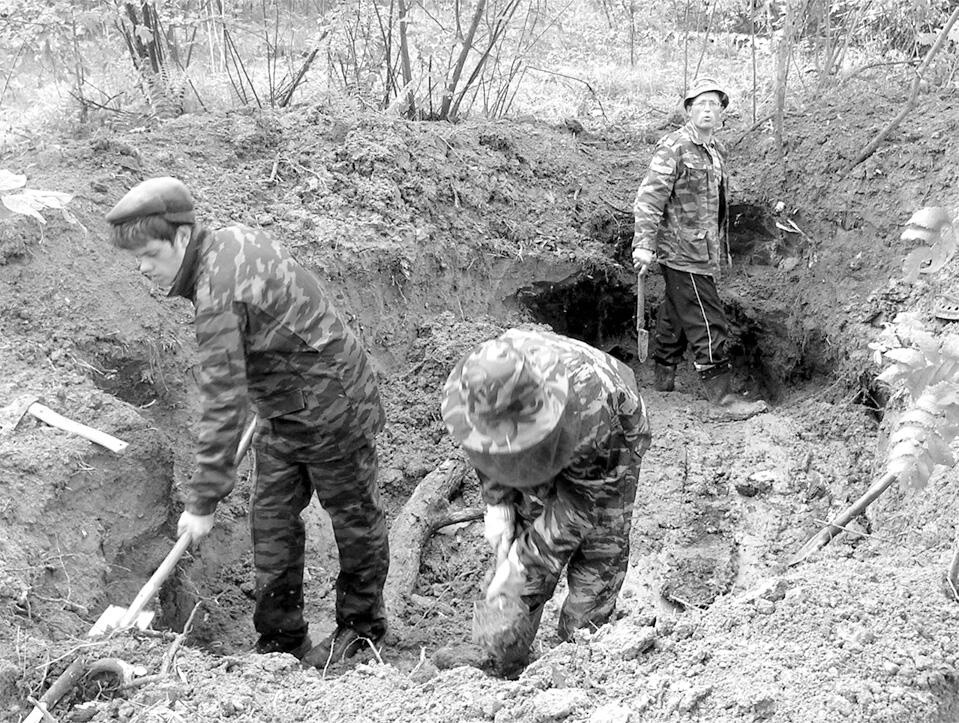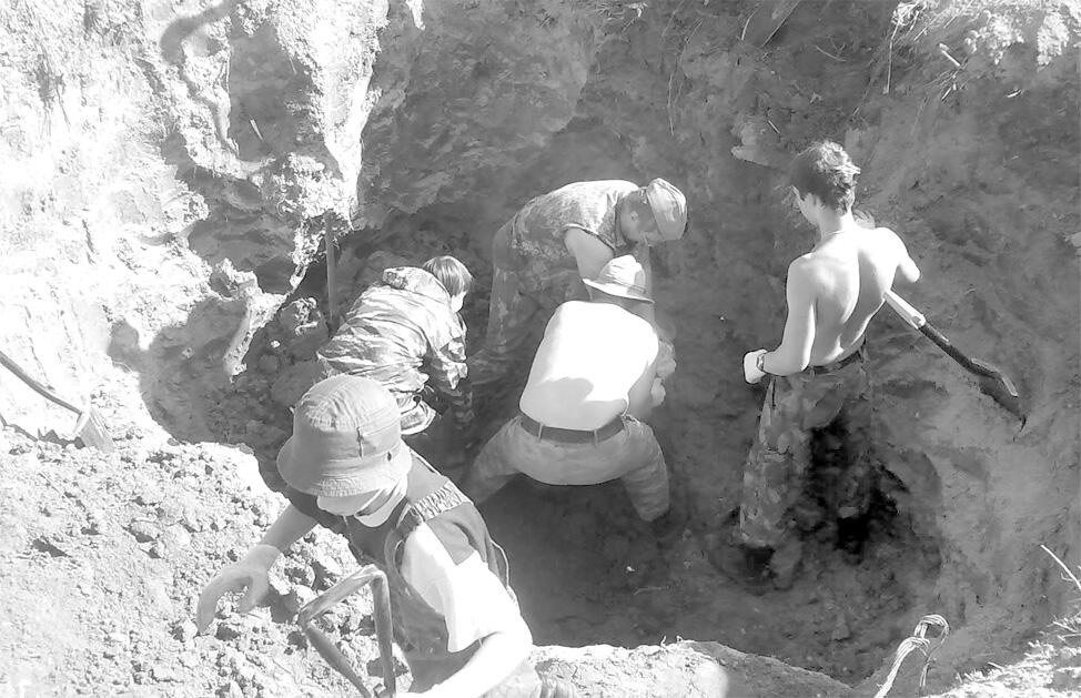 Раскопки захоронения на месте дислокации 438-го медсанбата в районе с. Говейново.