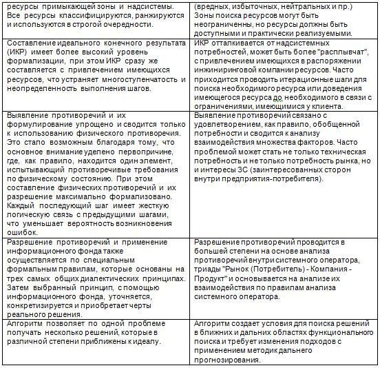 Однако, получаемые методом АРИнЗ решения также часто более жизнеспособны, поскольку отражают согласованное между всеми тремя элементами триады "Продукт Компания Потребитель (Рынок)" общее состояние системы, что в свою очередь способствует успешному внедрению и вхождению инжинирингового продукта на рынок.
