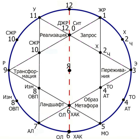 С одной стороны, это точка 12, которая принадлежит треугольнику реализации и символизирует окончание процесса реализации ЖР. С другой стороны, это точка 0, которая принадлежит треугольнику запроса и отражает новую неудовлетворённость или неизвестность, что соответствует новому процессу развития.