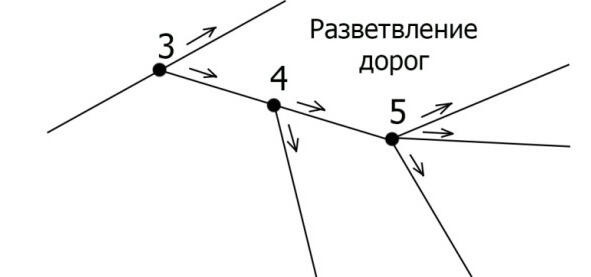 Допустим, что в точке 3 было 2 разветвления (указателя), в точке 4 тоже 2, а в точке 5 три, как показано на рис. 7. Первый выбранный и пройденный маршрут создал эти точки и разветвления.