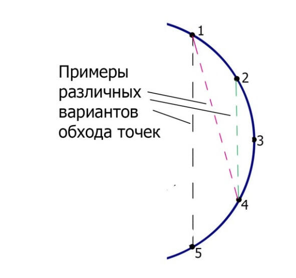 Если бы на этом рисунке мы пошли по другому маршруту, например, из точки 3, то точки 4 и 5 были бы другими. В этом случае разветвлений могло и не быть либо их количество и значения оказались бы иными. То есть на каждом из вариантов путей можно получить другую картину разветвлений в последующих точках.