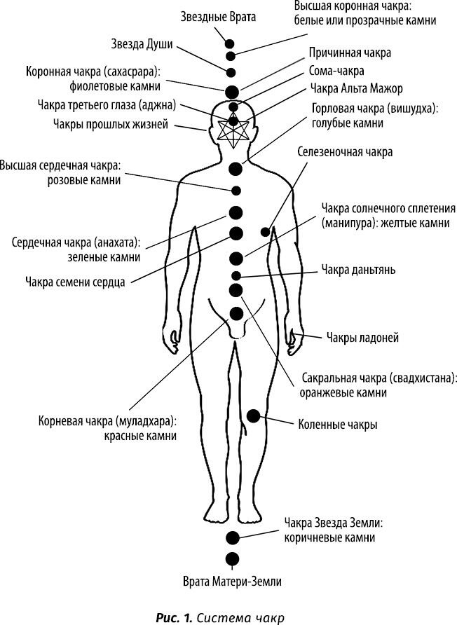 Эти проблемы запечатлены в кармическом и родовом тонких телах, мусорной ДНК и чакрах прошлых жизней и причинной. Возможно, слои придется постепенно счищать один за другим, пока не доберетесь до корня проблемы. Затем проблему можно будет устранить, а энергию преобразовать. Очищая родовую линию другого человека, которого нет рядом с вами, или отделяя от него духа, используйте собственное тело вместо него. Чаще всего все проходит хорошо, но если вы недостаточно защищены и не очень хорошо чувствуете опору, эта процедура может сделать вас уязвимым. Чтобы этого не произошло, поместите на чакры соответствующие кристаллы (см. рис. 1).