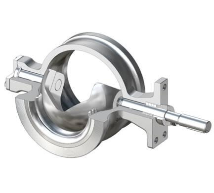 Развитие дисковых затворов идет по пути сближения с шаровыми кранами через развитие затворов сегментного типа. В качестве примера можно привести дисковый затвор МАПАГ компании Метсо, заменяющий собой в технологически схемах, как дисковые затворы, так и шаровые краны. Общий вид подобного сегментного дискового затвора приведен на рис.14.