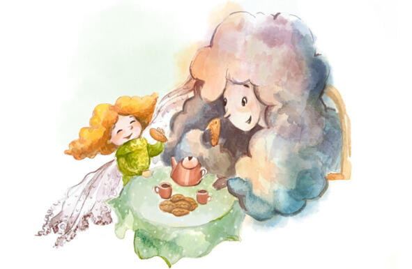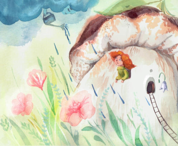 Осенька выглянула в окошко и увидела там тучку Акварельку, поливающую из лейки шляпку её дома.