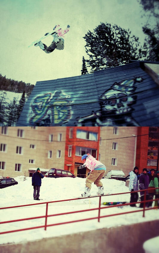 Антоха с Кузиным снимали дикий стритовый эдит под кодовым названием «АГОНЬТЕМАЖАРА». И на несколько спотов брали меня с собой. Например, очень крутая постройка на горе в Дивном: какой-то сарайчик с шиферной крышей, на который поставили в up пластиковую трубу. Нужно было мчать и на всех ходах вылетать с трубы, как из пушки, перелетать весь сарайчик и приземлять с высоты 3 метров на плоскость. Делать там method было просто эйфорически круто! Такие и подобные споты я обожаю всей душой! Когда огроменный дроп, мягкий снег, перелеты через строения, нестандартные конструкции, большая скорость. Таких спотов будет впоследствии еще много.