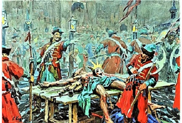 Убитого ночью дворянами Иваном Военковым и Григорием Волуевым самозванца ещё долго били ногами, секли мечами, кололи пиками. Его изуродованное тело бросили на стол у Лобного места на Красной площади, а на изувеченное лицо надели скоморошью маску.