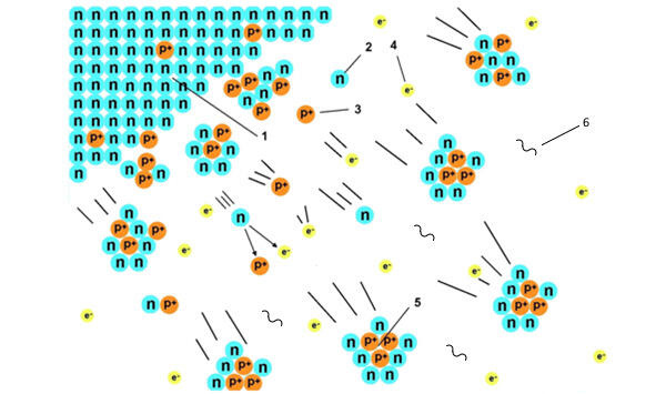 Нейтронные звезды не могут существовать вечно. При длительном горении энергетические возможности их исчерпываются, звезда начинает остывать. Нейтронное вещество звезды способно существовать только при очень высоких температурах, а при остывании становится нестабильным. После остывания до критической температуры нейтроны, как это и положено в нашем более холодном мире, способны на β-распад. Происходит взрыв нейтронной звезды с образованием химических элементов. Такие взрывы сопровождаются значительным выделением энергии, сильным излучением нейтронов, протонов, электронов, фотонов (рис.1).