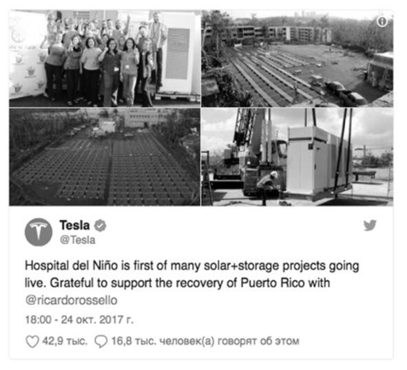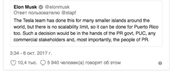 Изображение 5. «Команда Tesla уже делала это для многих небольших островов по всему миру, но масштабируемость не имеет границ, поэтому это можно обеспечить и в Пуэрто-Рико. Решение должны принять правительство Пуэрто-Рико, Комиссия по регулированию коммунальных услуг (PUC), все коммерчески заинтересованные стороны и, прежде всего, народ Пуэрто-Рико.»