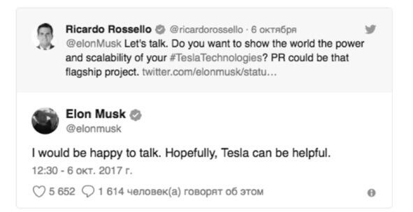 На следующий день к диалогу в Twitter присоединился губернатор региона Рикардо Росселло (Ricardo Rosello) и предложил обсудить возможность сотрудничества.
