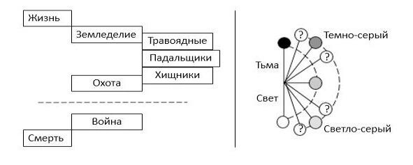 Процессы «расширения» и «сжатия». Первый процесс состоит в том, что диада высокой степени абстракции, в которой выделить переходное звено или медиатор весьма затруднительно, заменяется относительно более простой диадой, в которой такое звено легко допускается, затем один из крайних членов получившейся триады и ее медиатор заменяются еще более простой триадой и так далее (Рис. 1).