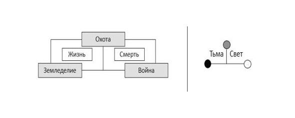 Бинарность. Так структура мифа включает логику бинарных оппозиций и их постепенного снятия. При этом мельком отмечается, что противоречие, если оно реально, снять невозможно, однако, полюса могут быть как действительно противоположными, так и нет, а только создавать ложное впечатление таковых, на самом деле являясь триадами, что становится видно благодаря следующим двум процессам.