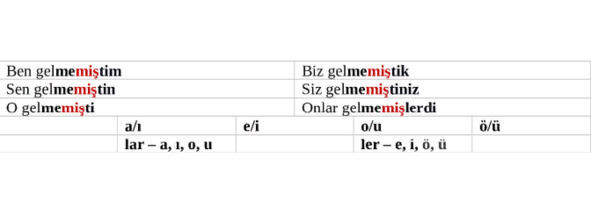 Преждепрошедшее время представляет собой сложную форму, состоящую из аффиксов двух прошедших времен прошедшего субъективного на -mış и прошедшего категорического на -tı и личных окончаний.