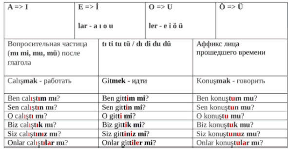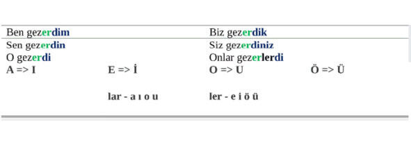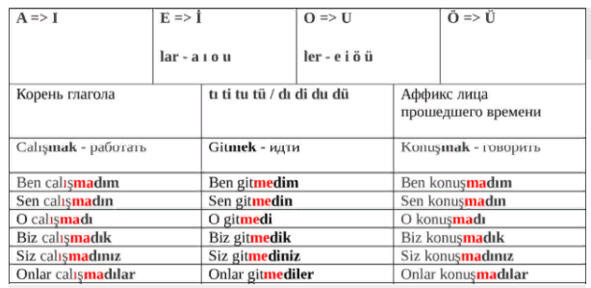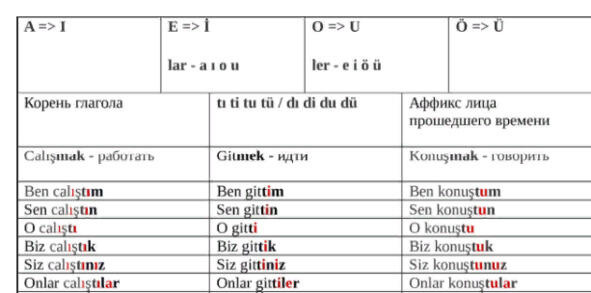 Это время обозначает действия, которые говорящий видел собственными глазами, переводится на русский язык обычно формой глагола совершенного вида. К основе глагола присоединяется аффикс прошедшего времени (tı ti tu tü) или (dı di du dü) в соответствии с законом гармонии согласных.