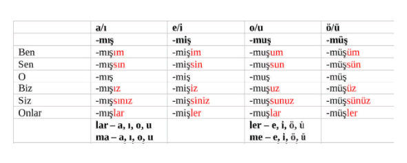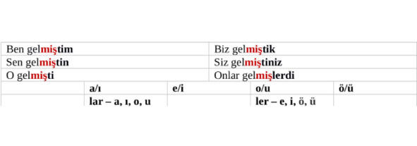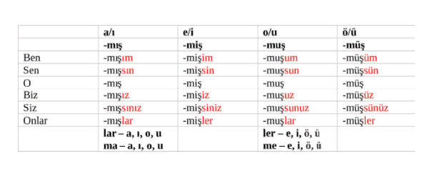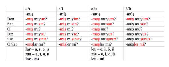 Например, вы спрашиваете друга, куда он ездил на летние каникулы. Он говорит вам, что ездил в Турцию. Теперь, если кто-то спросит вас, куда ваш друг ездил на летние каникулы, вам следует ответить, употребив прошедшее субъективное (не очевидное) время (mış/miş/muş/müş):