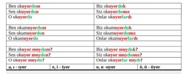 Схема сказуемого: глагол (корень или основа) + аффикс настоящего продолженного времени (-yor) + аффикс субъективной модальности (-mış) + личный аффикс.