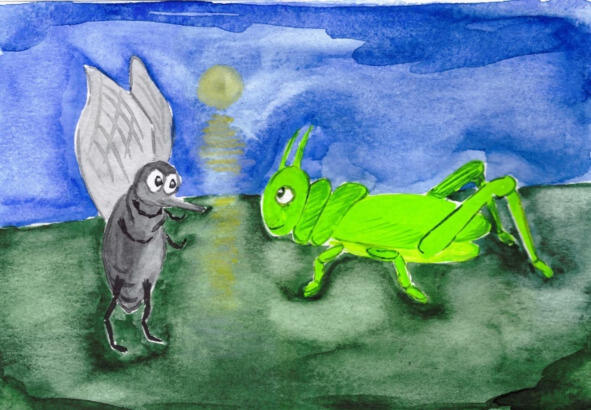Кузнечек оказался сообразительным и не раздумывая тремя большими прыжками умчался прочь от грозящей ему горящей опасности. Жики устремился за ним. Без труда найдя кузнечика в траве, Мухослоник сел рядом.