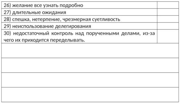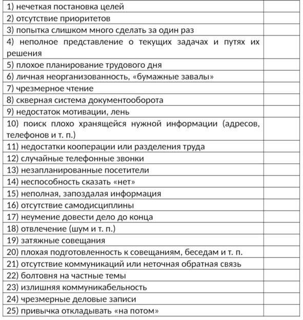Приведенный список «воров времени» можно рассматривать как пример или своего рода «точки старта», отталкиваясь от которой можно (и нужно!) придумать свой собственный список. При анализе процессов и ситуаций конкретной жизнедеятельности с позиции самоорганизации невозможно обойтись без составления собственного уникального списка хронофагов. Список можно составить, проведя ту же фотографию дня, проанализировав те моменты, на которых мы откровенно теряем время.