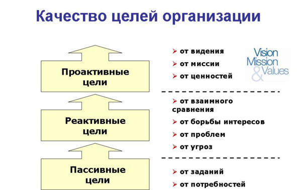 Нижний уровень пассивные цели. Эти цели формулируются вынужденно. Это базовые цели. Но они не являются предметом нашего выбора. Это необходимое условие для существования и выживания организации. Пассивные цели исходят от потребностей или от заданий. Цели от потребностей это обеспечение стабильности, управляемости, прибыльности. Если этого не будет, то организация перестанет существовать. Цели от заданий формулируются на основе внешних требований к организации, исходящих, например, от органов власти («Ликвидировать задолженность по уплате налогов») или собственников бизнеса («Увеличить годовую выручку предприятия на 25%»). Это задания, которые не обсуждаются и обязательны для исполнения.