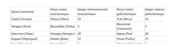 3: 4950. ЭКЗАЛЬТАЦИЯ И ДЕБИЛИТАЦИЯ ПЛАНЕТ: Меша [Овен], Вришабха [Телец], Макара [Козерог], Канйа [Дева], Карка [Рак], Мина [Рыбы] и Тула [Весы] считаются соответственно раши [знаками] экзальтации семи грах Сурйи и остальных. Градусы максимальной экзальтации этих грах соответственно равны 10, 3, 28, 15, 5, 27 и 20. А в седьмом раши от упомянутого раши экзальтации каждая граха находится в своей дебилитации (максимальный градус такой же).