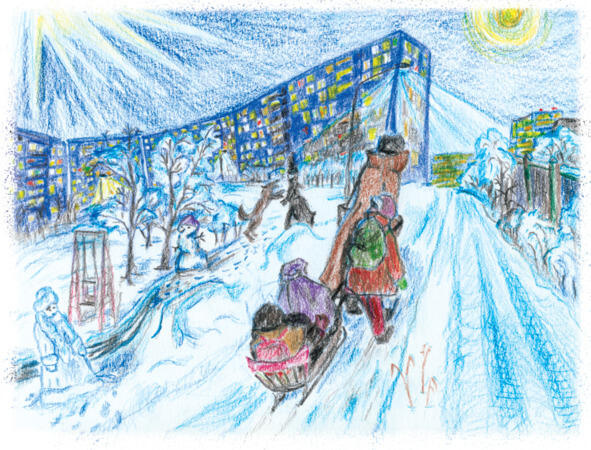 Мама снова устроила на санках мешок. Нас окружали лабиринты огней до самого неба. Я не могла сообразить, по какой же тропинке между этих огромных стен с тысячами окон надо пойти? Мама показала рукой: «вон туда». Вообще-то с мешком вышло не очень удобно. Мы забыли верёвку, и по дороге нам с Лёкой приходилось его постоянно придерживать.