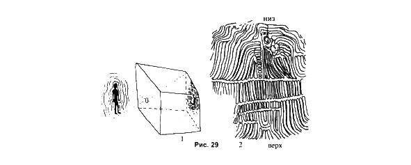 Во Франции в провинции Бретань женщины специально проводили ночи напролет у дольменов, чтобы излечиться от бесплодия, вымолить себе счастливый брак и т. п. Об этом же свидетельствует рисунок на задней стенке одного из французских дольменов в Гаврини. Здесь нанесен рельеф в виде стилизованной человеческой фигуры, состоящей из параллельных линий рис. 16. Обращает на себя внимание то, что часть этих линий напоминает акупунктурные линии человека, известные специалистам по иглоукалыванию. Но большинство линий выходит далеко за пределы контуров тела человека и скорее напоминает линии его ауры. Особо выделены на рельефе сердце и нижняя часть позвоночника, т. е. энергетически наиболее важные органы. Весьма любопытна часть рельефа, соответствующая нижней половине тела человека (ниже паховой линии). В целом, весь этот «магический портрет», по-видимому, представляет собой специальный вибратор, создающий объемную модель энергетических полей человека.