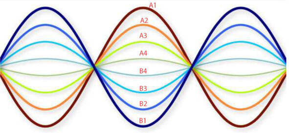 Однако здесь есть взаимно перпендикулярной плоскости и взаимно перпендикулярные волны. Всего для случая с 4-х ступенчатой структуры формируется две пары взаимно перпендикулярных волн, определяемые размером или А1 или В1 и соответствующие частоты, и еще четыре сочетания взаимно перпендикулярных волн разной частоты. Эти взаимно перпендикулярные структуры формируют волны с фигурами Лиссажу разного вида, которые будут рассмотрены далее.