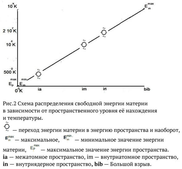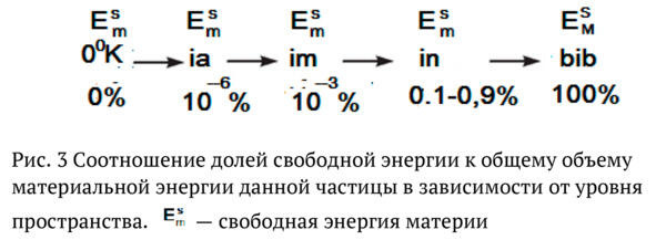 При температуре 00 K в материальных телах нет свободной энергии материи, поэтому в них отсутствуют колебательные движения составляющих их частиц. А вот пространственная энергия в силовых нитях пространства, наоборот, находится в максимальном количестве (Рис.2). По мере роста температуры материальных тел в них увеличивается количество свободной материальной энергии. Каждому уровню пространства соответствует своя доля свободной энергии пространства по отношению к общему объему материальной энергии данной частицы (Рис.3). Так, например, доля свободной материальной энергии (Em) в межатомном пространстве, которая может переходить в энергию пространства (Ep) составляет 0, 000001%, во внутриатомном пространстве соответственно 0,001%, а во внутриядерном пространстве составляет 0,10,9%. Таким образом, самые высокие показатели свободной энергии, законсервированной в связях между частицами имеет внутриядерное пространство ядер химических элементов. Наибольшее же её количество сосредоточено в связях аннигилирующих частиц. К примеру, при аннигиляции 1г вещество антивещество выделяется 1014 джоулей, в то время как при делении 1 грамма урана выделяется 1011 джоулей тепловой энергии. Но и при аннигиляции полного превращения массы материи в энергию не происходит. В этом случае масса вещества распадается до гравитонов, а антивещества (антиматерии) до простонов. Полное превращение массы материи в энергию происходило при Большом Взрыве (bib). В это время масса всех гравитонов, составлявших материю, преобразуется в энергию.