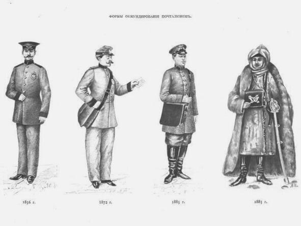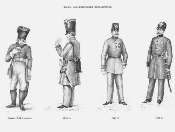 В 40-х годах для почтальонов вводится форма нового образца: красный суконный кафтан с белым поясом. Он надевался поверх обыкновенного платья. Картузы тоже были красными. Почтарь носил на груди медную бляху с государственным гербом, а через плечо шнурок с рожком. Особая форма одежды существовала и для почтовых кондукторов и ямщиков. Позже в 18561857 годах почтовая форма была изменена.