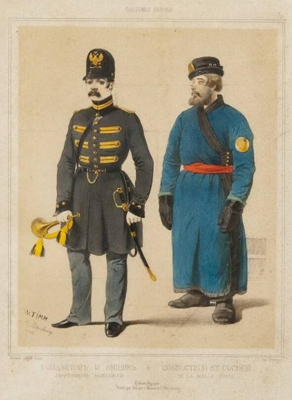 Художник В. Тимм. Кондуктор и ямщик почтовых экипажей, 1844.