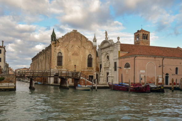Начинаем с района Каннареджо (Cannaregio), где на задворках храма Santa Maria di Nazaret XVII века, он же церковь Босоногих (Chiesa degli Scalzi) и резиденция ордена босоногих кармелитов, в шаговой доступности от ж/д вокзала и видом из окна на колокола, будившие нас по утрам мелодичным звоном, находился наш отель Abbazia. Место довольно тихое, хотя до оживленной улочки Rio Terà Lista di Spagna и моста Босоногих (Ponte degli Scalzi), обязанного своим появлением вышеназванной обители, метров сто от силы.