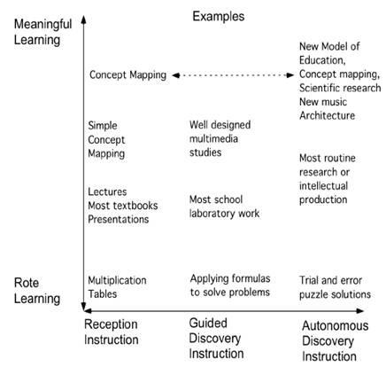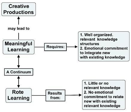 Творчество является результатом очень высокого уровня осмысленного обучения. Люди часто путают rote learning (рутинное обучение зубрежку) и значимое обучение с обучающими подходами, которые могут варьироваться от прямого представления информации (которая может быть концептуально неясной или концептуально явной) до индивидуальных подходов к осмыслению знаний, где студент воспринимает закономерности и создает свои собственные концепции. Как прямая презентация и открытие методов обучения может привести к высокой рутинности или осмысленному обучению со стороны ученика, в зависимости от особенностей обучающегося и организации учебных материалов. Эти различия показаны на рисунке 3.