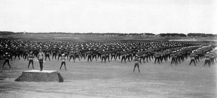 Массовые вольные упражнения солдат во время смотра сокольской гимнастики.