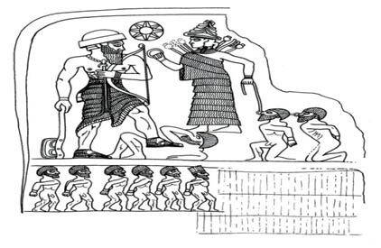 Los reyes sometidos son representados según la tradición de Anatolia, en términos zaza bıne dare (bajo el árbol). Sobre el monumento de las victorias, en escritura acadia, el rey indica que las tierras conquistadas pertenecen a los sumerios, antepasados de los acadios.