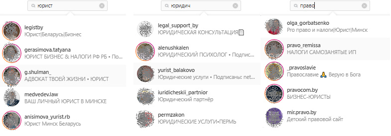 Самый очевидный способ использовать встроенный поиск в социальной сети. Если вы ищете блогера-юриста, логичнее всего так и написать «юрист». Но попробуйте поставить себя на место того самого юриста и подумать, какие ещё формулировки он может использовать: «юридические услуги», «адвокат», «право».