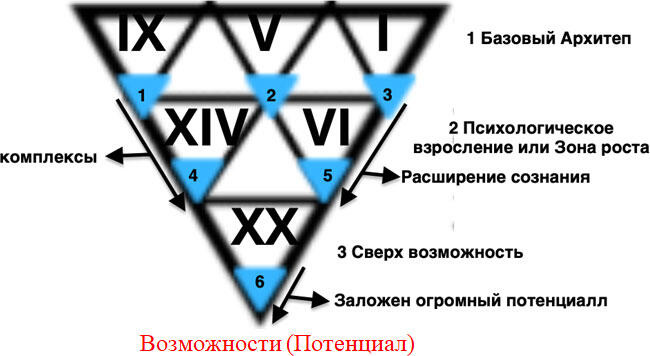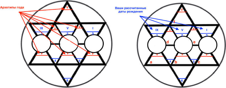 Дальше в верхних и нижних треугольников ставим Архетипы года. Затем складываем Ваш расчет даты рождения + Архетип года = и получаем цифры в центре (в кругах)