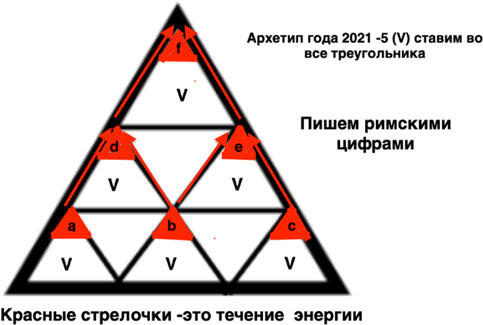 Годовой архетип мы ставим во всех треугольниках, и мы ставим цифру V (5) нашего правителя года ЖРЕЦА. Именно он соединяясь с нашими расчетами, с нашими архетипами базовыми, открывает нам, что-то новое.